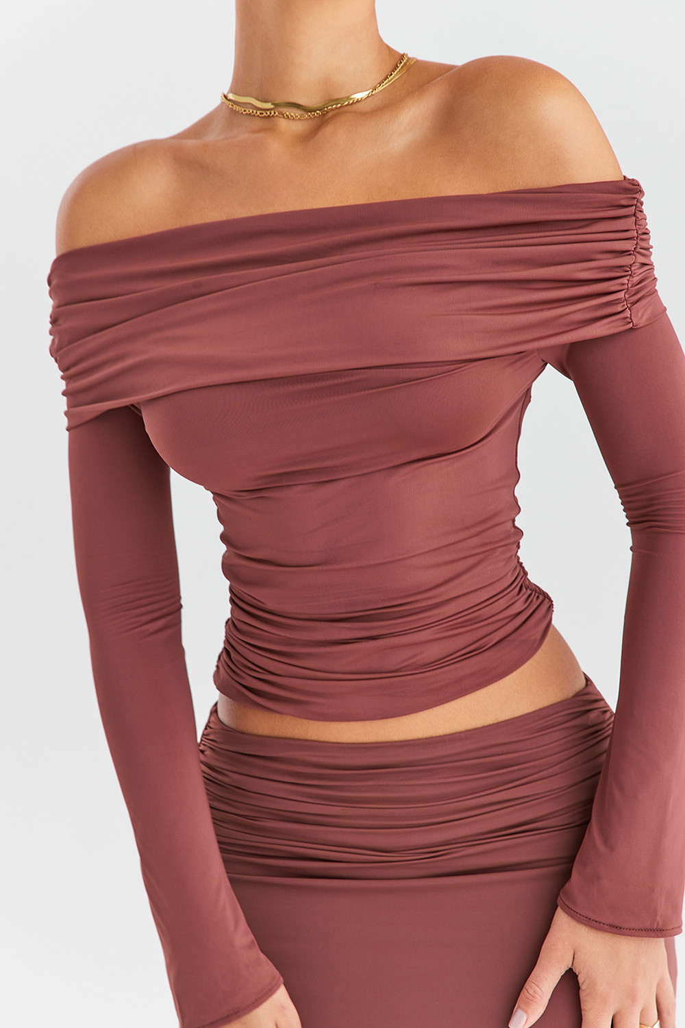 Cut from stretch jersey in a smooth coffee hue, we love how the draped neckline of this top bares your décolletage as it elegantly falls off the shoulder. It features fitted long sleeves and the bodice has a comfortably close fit that's beautifully gathered at the waist. It's fully lined for comfort and looks ultra chic styled with our